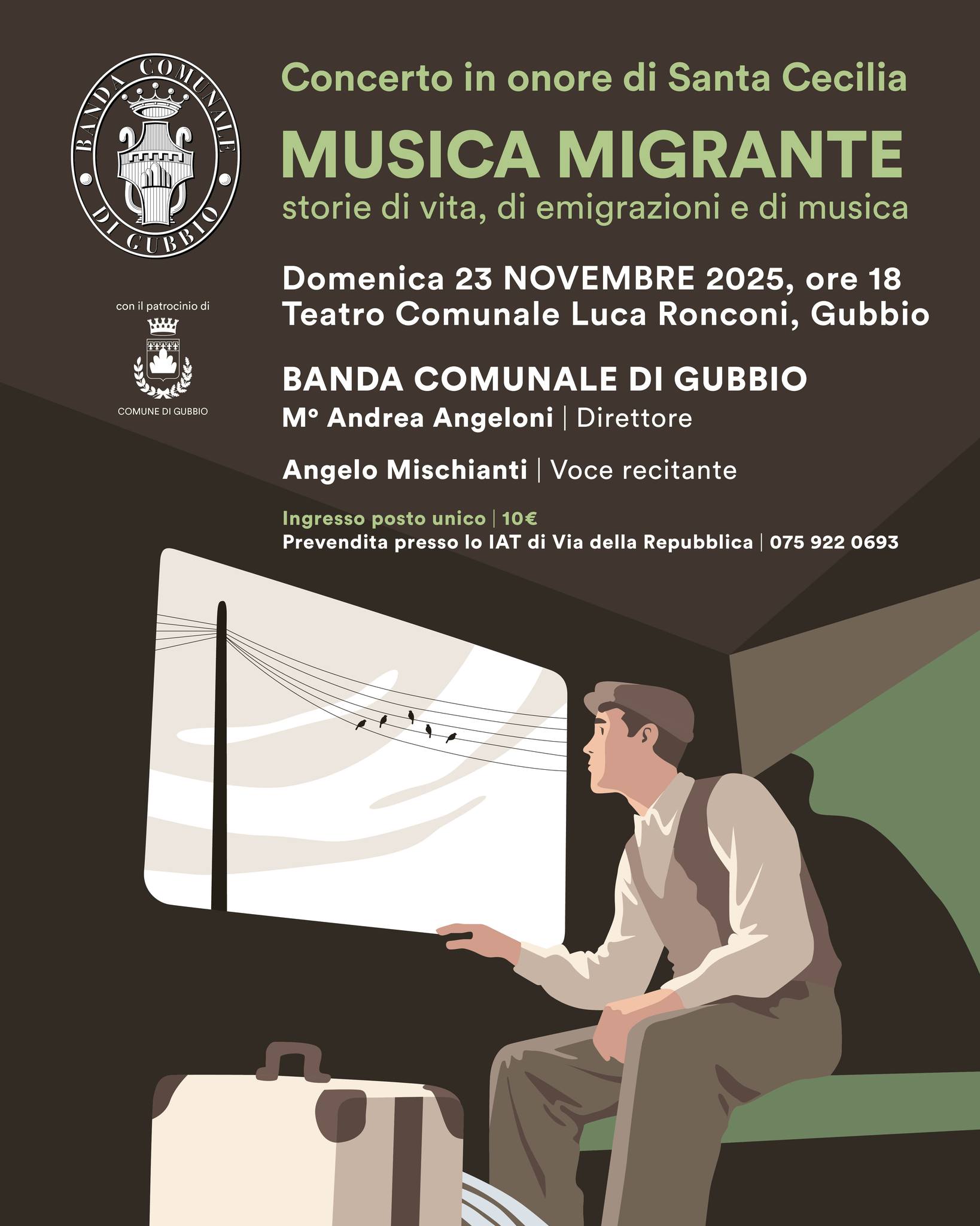 GUBBIO (19/11/2025) - Si intitola“Musica Migrante. Storie di vita, di emigrazioni e di musica” il concerto che la Banda Comunale di Gubbio proporrà domenica 23 novembre alle 18 al Teatro Comunale “Luca Ronconi”, in occasione della tradizionale Festa di Santa Cecilia: un percorso musicale e narrativo che intreccia memorie, viaggi, spostamenti e incontri, trasformando la musica in filo conduttore delle storie di migrazione che hanno attraversato il tempo e le comunità.