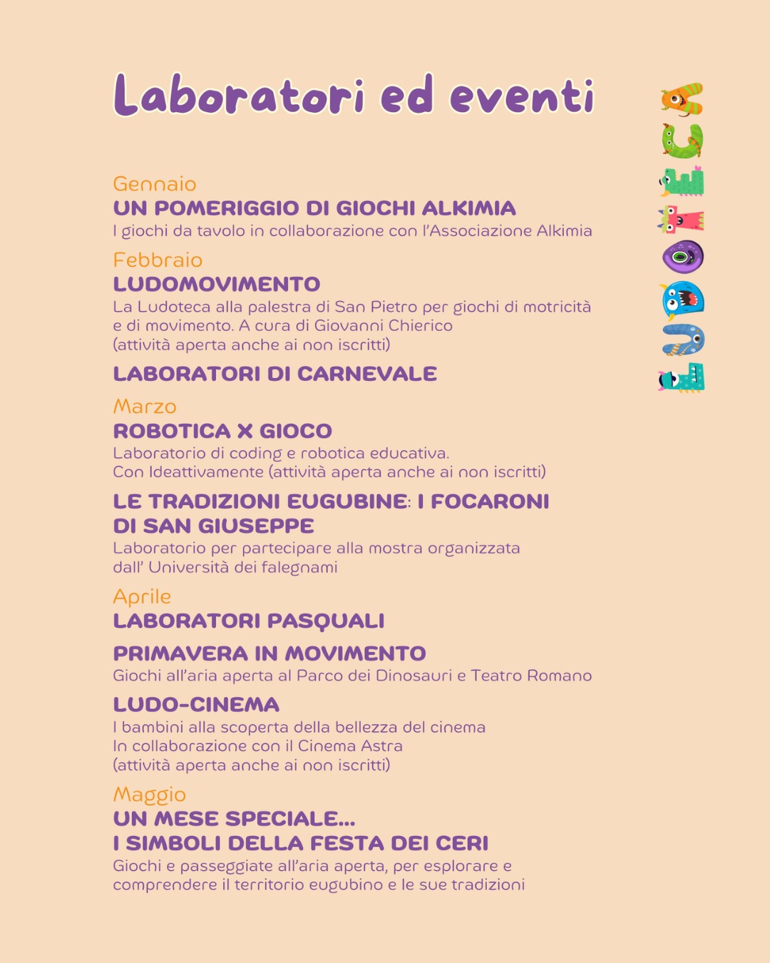 La Ludoteca offre una varietà di attività e laboratori creativi, giochi da tavolo, giochi all’aperto, eventi tematici e feste. In questo tipo di ambiente, i bambini hanno la possibilità di giocare liberamente, sviluppare le proprie abilità sociali, relazionali e cognitive e di apprendere o sviluppare nuove competenze, guidati e stimolati da educatori ed educatrici competenti, anche con il supporto di esperti.