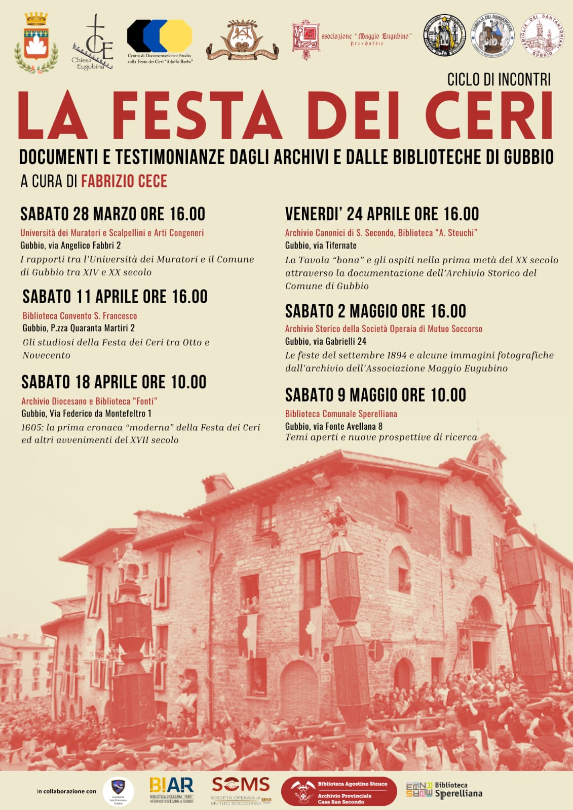 L’iniziativa nasce dalla collaborazione tra Comune di Gubbio e Centro di documentazione “Adolfo Barbi”, Diocesi Eugubina, Università dei Muratori, Maggio Eugubino, Famiglia dei Santubaldari, Famiglia dei Ceraioli di San Giorgio e Famiglia dei Santantoniari, con il contributo di importanti istituzioni culturali cittadine tra cui Biblioteca e Archivio Diocesano, Biblioteca del Convento di San Francesco, Società Operaia di Mutuo Soccorso, Biblioteca e Archivio “A. Steuco” della Canonica di San Secondo.