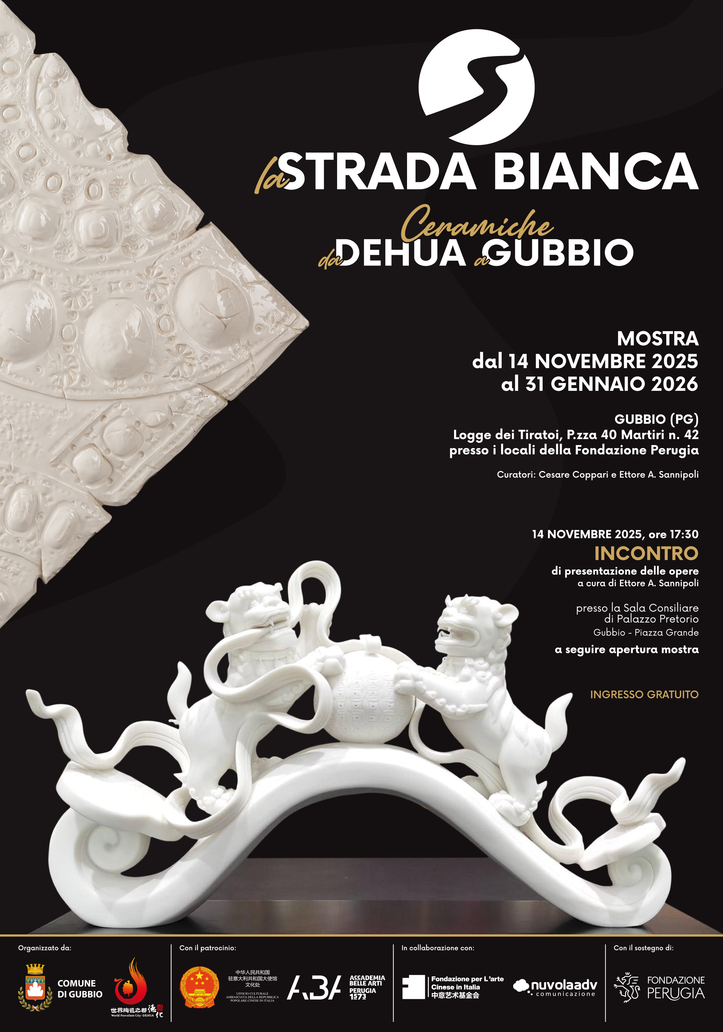 Nel pomeriggio, alle 17, è previsto un incontro di presentazione delle opere a cura di Ettore A. Sannipoli, mentre alle 18.30 verrà inaugurata la mostra “Da Dehua a Gubbio. La strada della ceramica”, il cui ingresso sarà completamente gratuito e che sarà ospitata nei locali della Fondazione Perugia, sotto le Logge dei Tiratori, accanto agli spazi attualmente utilizzati per l’esposizione delle ceramiche dell’esposizione “Francesco e frate lupo”. L’esposizione riunisce per la prima volta dopo anni tredici artisti ceramisti eugubini, con circa 30 opere realizzate in porcellana bianca cinese, appena arrivate a Gubbio, affiancate da altrettante creazioni degli artisti locali. La mostra, che è a cura di Cesare Coppari ed Ettore Sannipoli, resterà visitabile fino al 31 gennaio 2026, per poi intraprendere un percorso itinerante nei cinque comuni della Strada della Ceramica, fino a Faenza, dove approderà in occasione di “Argillà”, a fine estate.