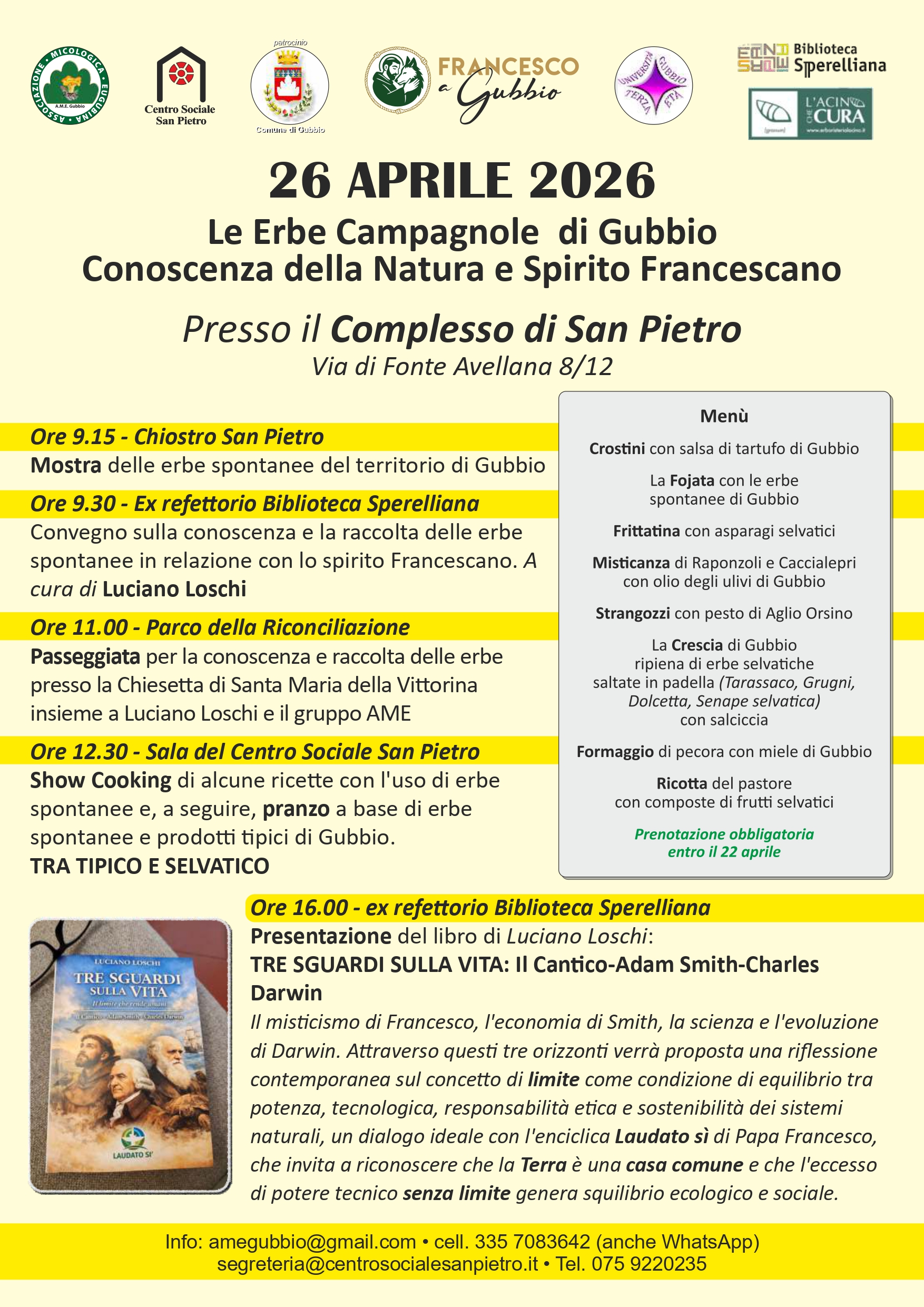 L’iniziativa, patrocinata dal Comune di Gubbio e dal Comitato “Francesco a Gubbio”, è organizzata dal Centro Sociale San Pietro in collaborazione con AME – Associazione Micologica Eugubina, Università della Terza Età e Biblioteca Sperelliana.